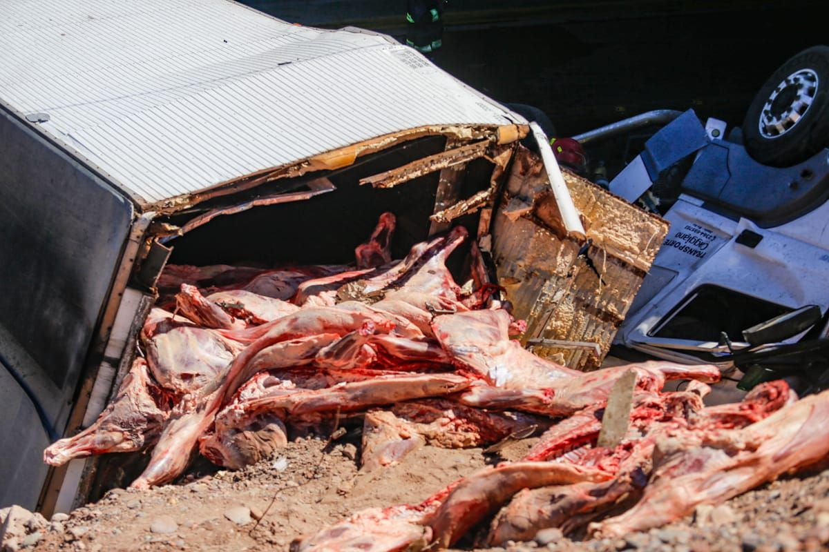 El accidente ocurrió en Acceso Este y Cañadita Alegre (Guaymallén), cuando un camión fue impactado por un utilitario. El rodado mayor cayó y volcó su carga de carne