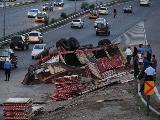 Según fuentes policiales, la mala distribución de la carga o el peso excesivo de ella produjo que el camión volcara sobre su derecha.