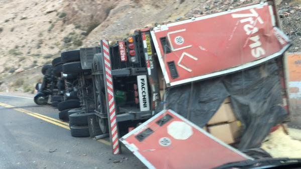 Un camión protagonizó un accidente de tránsito en solitario en la tarde de este viernes en Uspallata tras volcar a la vera de la ruta 7.El hecho ocurrió minutos después de las 18 en el kilómetro 1119, por donde Sergio Piega (30) circulaba hacia la provincia en un Scania.