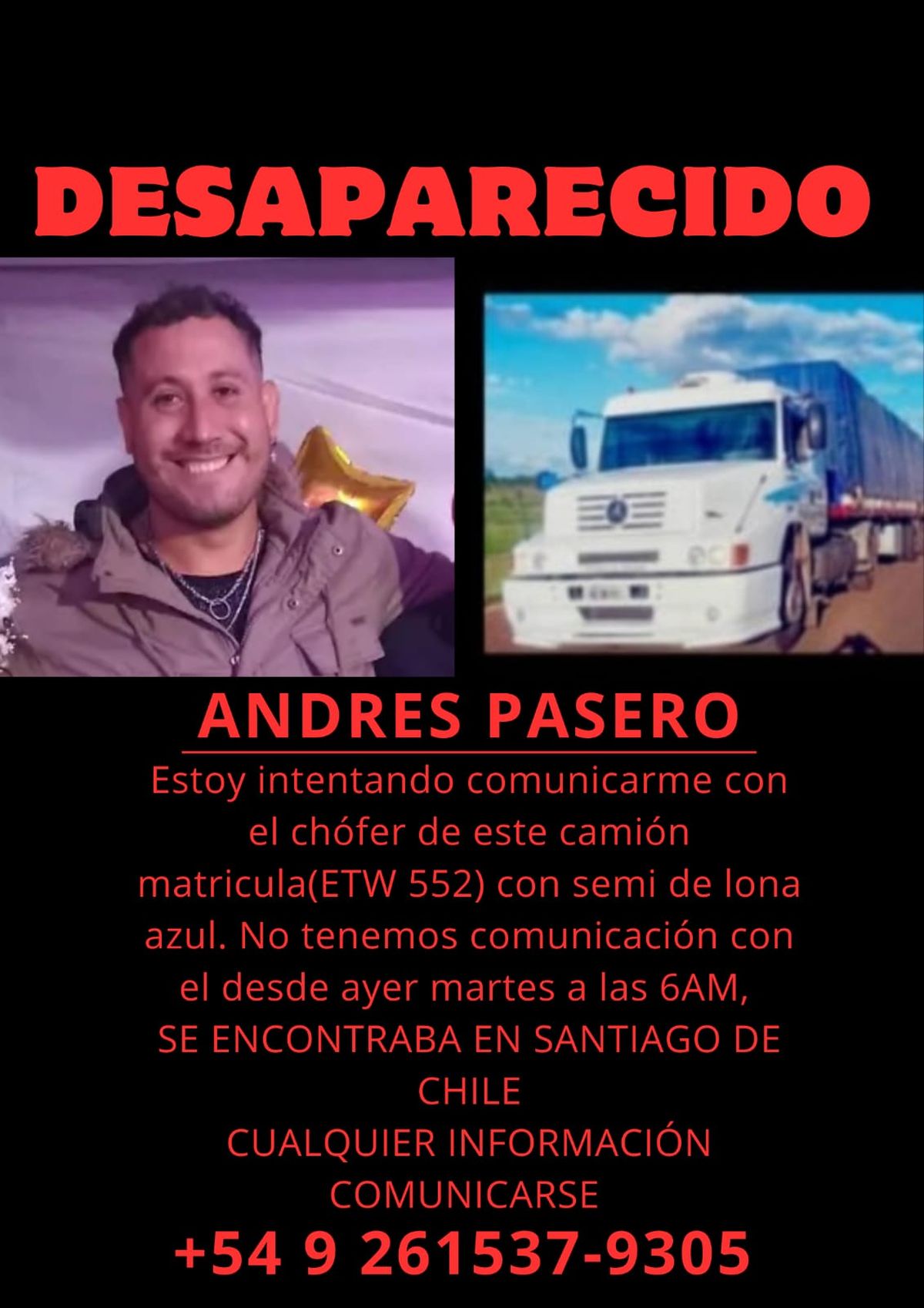 Un camionero mendocino, Andrés Pasero (34), desapareció tras viajar a Santiago de Chile en un camión semirremolque cargado de arroz. Su esposa y sus tres hijos no logran dar con su paradero desde la última comunicación que mantuvieron con él, que data de las 6 del martes 8 de octubre.