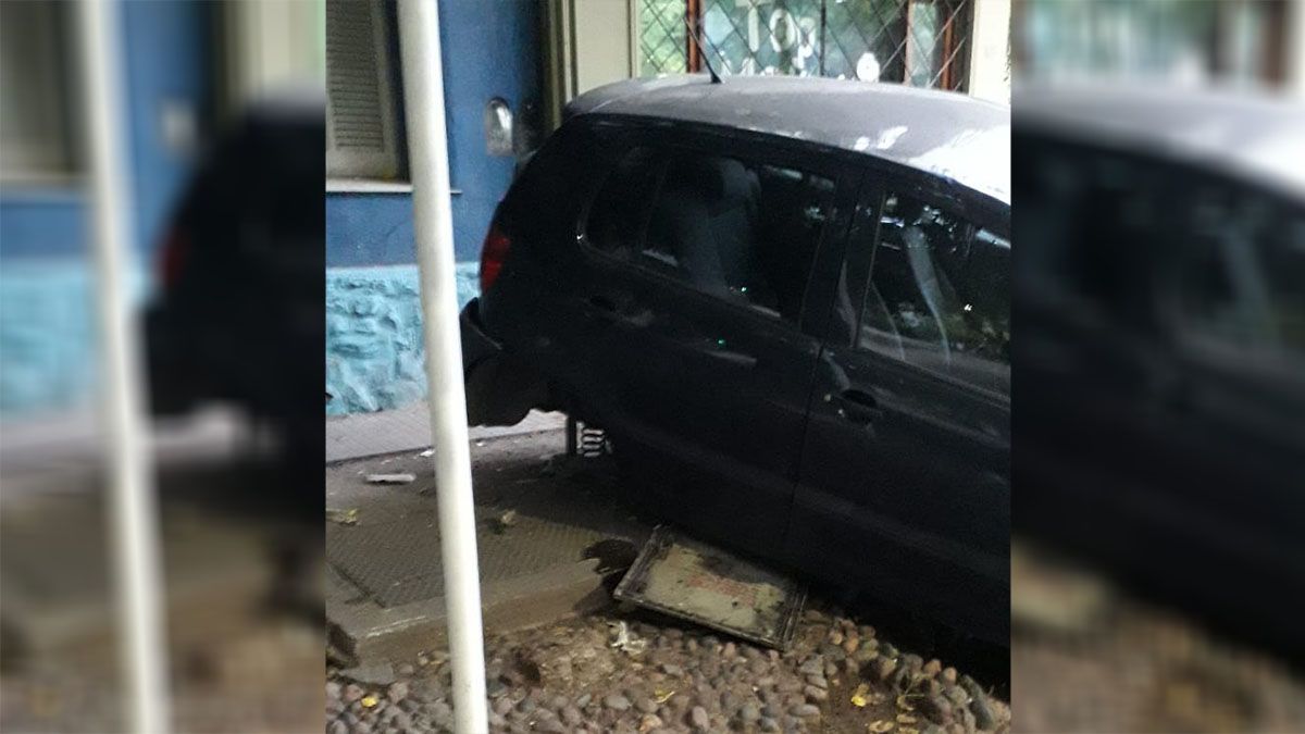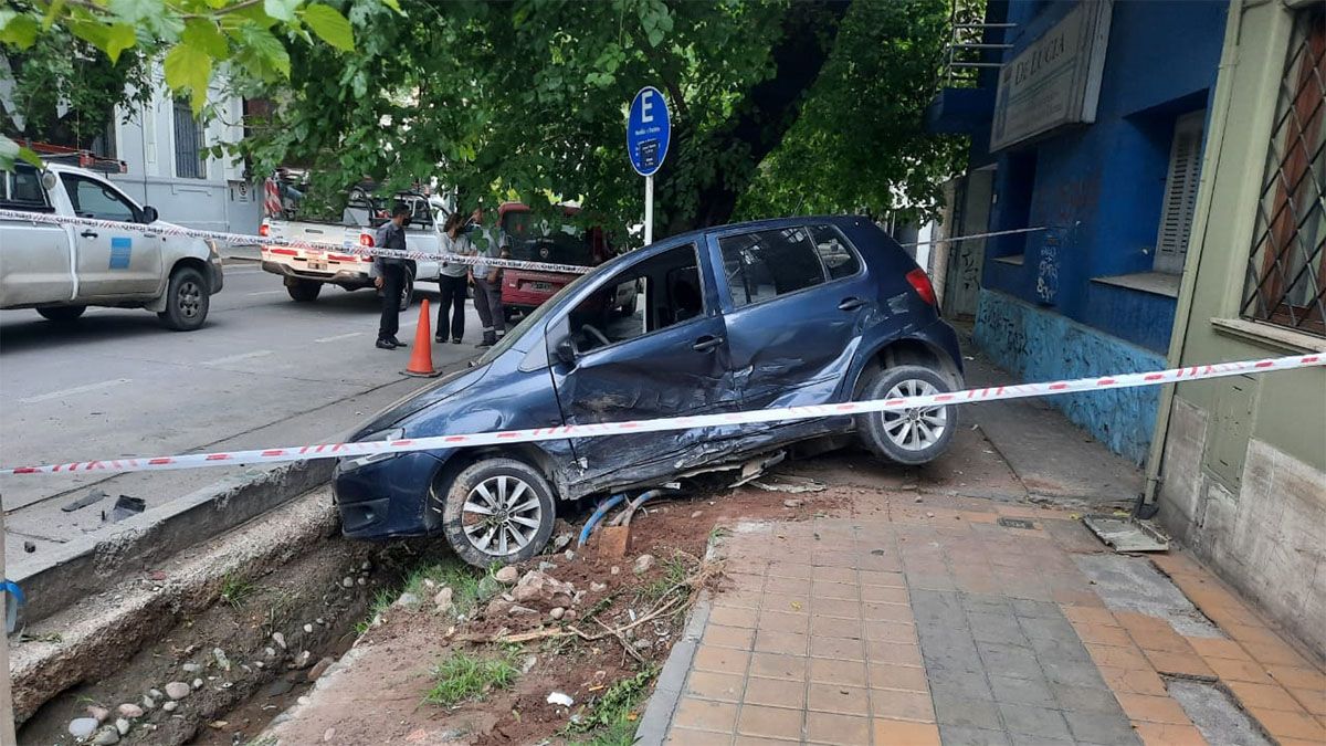 Este fue el auto que terminó entre la acequia y la vereda, y que destrozó una caja de distribución eléctrica de Edemsa.