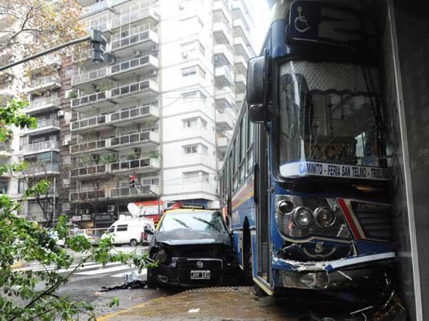 Un colectivo terminó sobre la vereda e incrustado contra un edificio en el barrio porteño de Balvanera, tras ser embestido lateralmente por un taxi, como resultado de lo cual ocho personas resultaron con heridas leves, según informaron fuentes policiales.El accidente entre el interno de la línea 29 -que une La Boca con Olivos- y un taxi que trasladaba a dos pasajeras, ocurrió a las 7,20 en la esquina de Viamonte y Avenida Pueyrredón, en momentos en que se abatía una fuerte lluvia en la ciudad.
