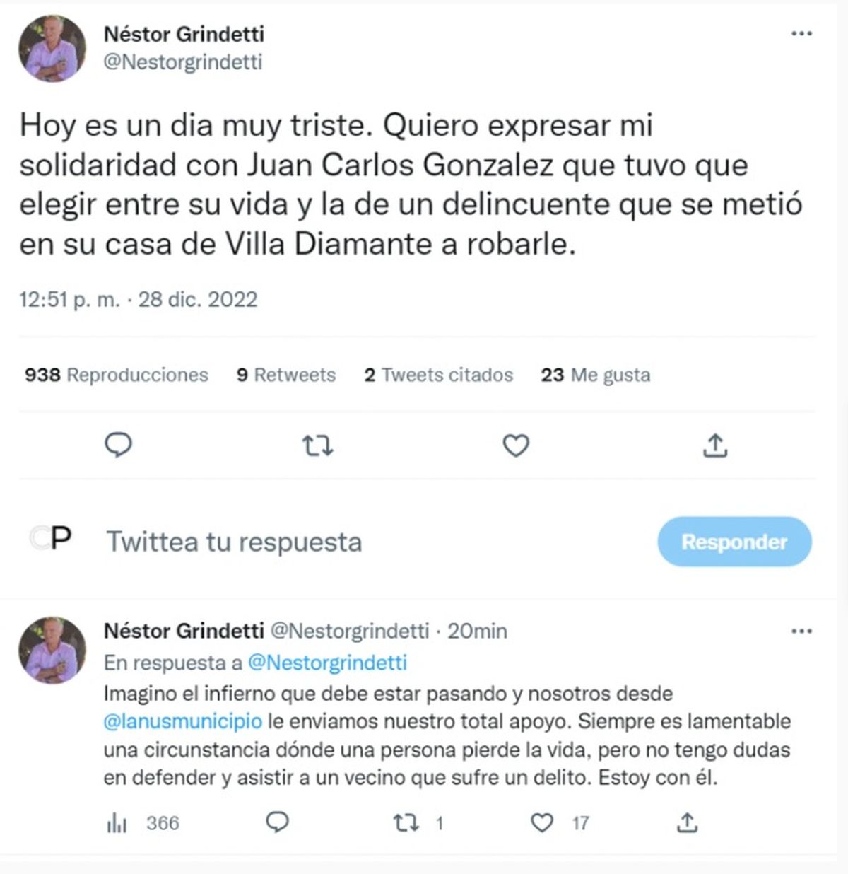 En tanto, el intendente de Lanús, Néstor Grindetti, se manifestó al respecto en redes sociales, solidarizándose con el jubilado. “Hoy es un dia muy triste. Quiero expresar mi solidaridad con Juan Carlos Gonzalez que tuvo que elegir entre su vida y la de un delincuente que se metió en su casa de Villa Diamante a robarle”, expresó.
