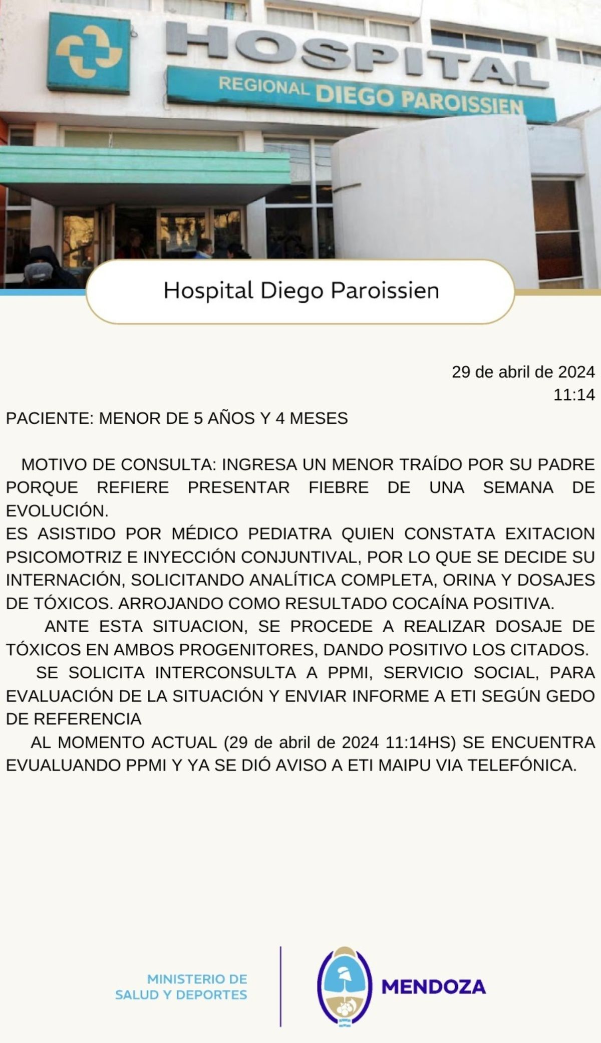 Un nene de 5 años quedó internado en Maipú porque dio positivo en el test de cocaína