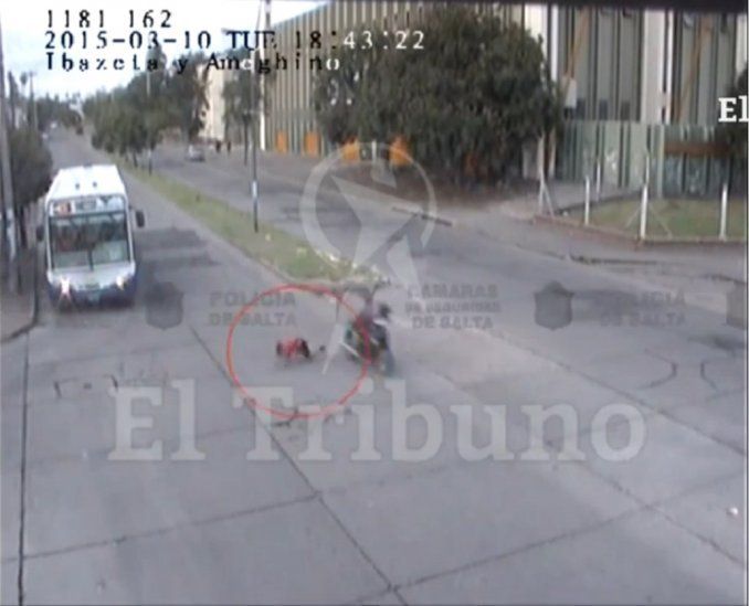 Un chico de 10 años cruzó la calle sin mirar en la esquina de Ameghino e Ibazeta, en Salta, y fue embestido por una moto.Las imágenes del accidente fueron registradas por las cámaras de seguridad de la provincia. Lo llamativo del episodio, además de la rapidez con la que el chico se levanta, es que a su paso sale su padre, que lo persigue hasta alcanzarlo.