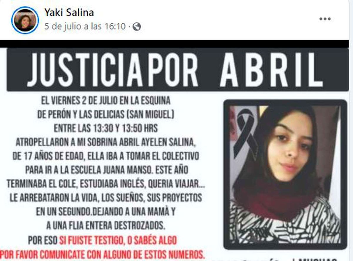 (Editado por Marcos Barrera) Abril Ayelén Salina murió atropellada el pasado viernes cuando iba camino al colegio en la localidad bonaerense de San Miguel, producto del impacto falleció horas después en el hospital. Familiares y amigos de la chica viralizaron su imagen para pedir la colaboración de testigos que puedan relatar ante la Justicia las circunstancias en que ocurrió el choque. murió atropellada