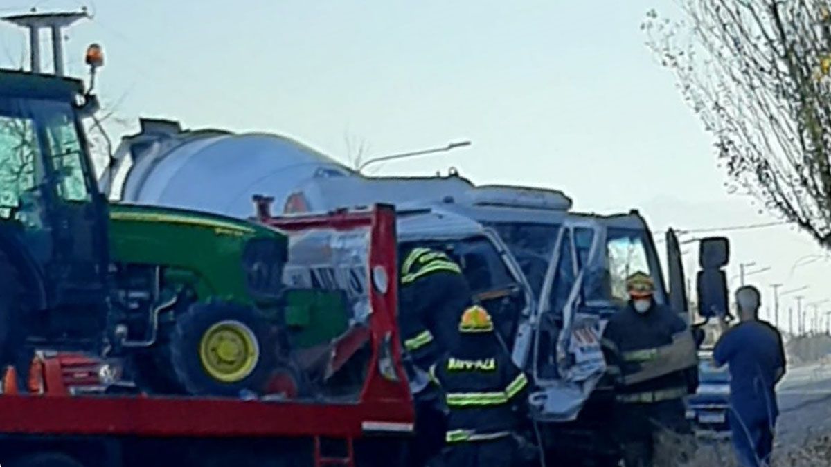 Un camión hormigonero y otro que transportaba un tractor impactaron de frente en ese cruce, y como consecuencia los choferes sufrieron algunas heridas.
