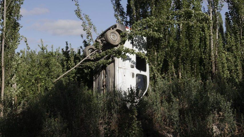 Justamente a unos 1500 metros al sur de la Ruta Nacional 22, la camioneta se había cruzado de carril impactó contra un montículo de tierra y luego, literalmente, voló sobre un desagüe de más de 2,5 metros hasta quedar encastrada contra una hilera de álamos.