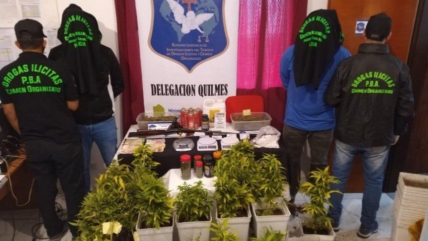 Se secuestraron cientos de dosis de cocaína fraccionada, marihuana compactada en cogollos, semillas y plantas de distintos tamaños, flores en frasco de vidrio, armas de fuego, balanzas de precisión, elementos de corte y fraccionamiento, anotaciones, dinero en efectivo, celulares y productos para el cultivo de las plantas.