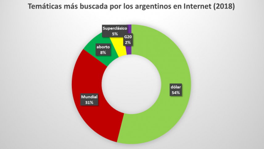 Los números de Scidata, con base en datos proporcionados por Google, muestran que la temática del dólar se llevó la mayor atención de los argentinos, seguido por el Mundial de Rusia, el aborto, el Superclásico entre River y Boca, y la cumbre del G20.