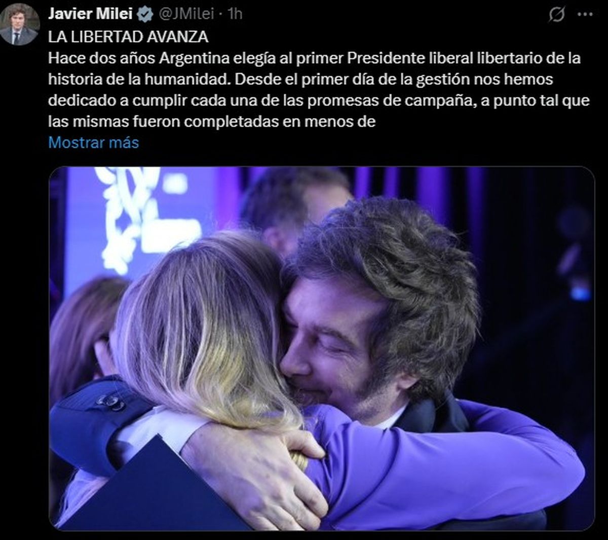 A través de su cuenta de X, y al cumplirse dos años de aquella elección, Javier Milei publicó: “LA LIBERTAD AVANZA. Hace dos años Argentina elegía al primer Presidente liberal libertario de la historia de la humanidad”.