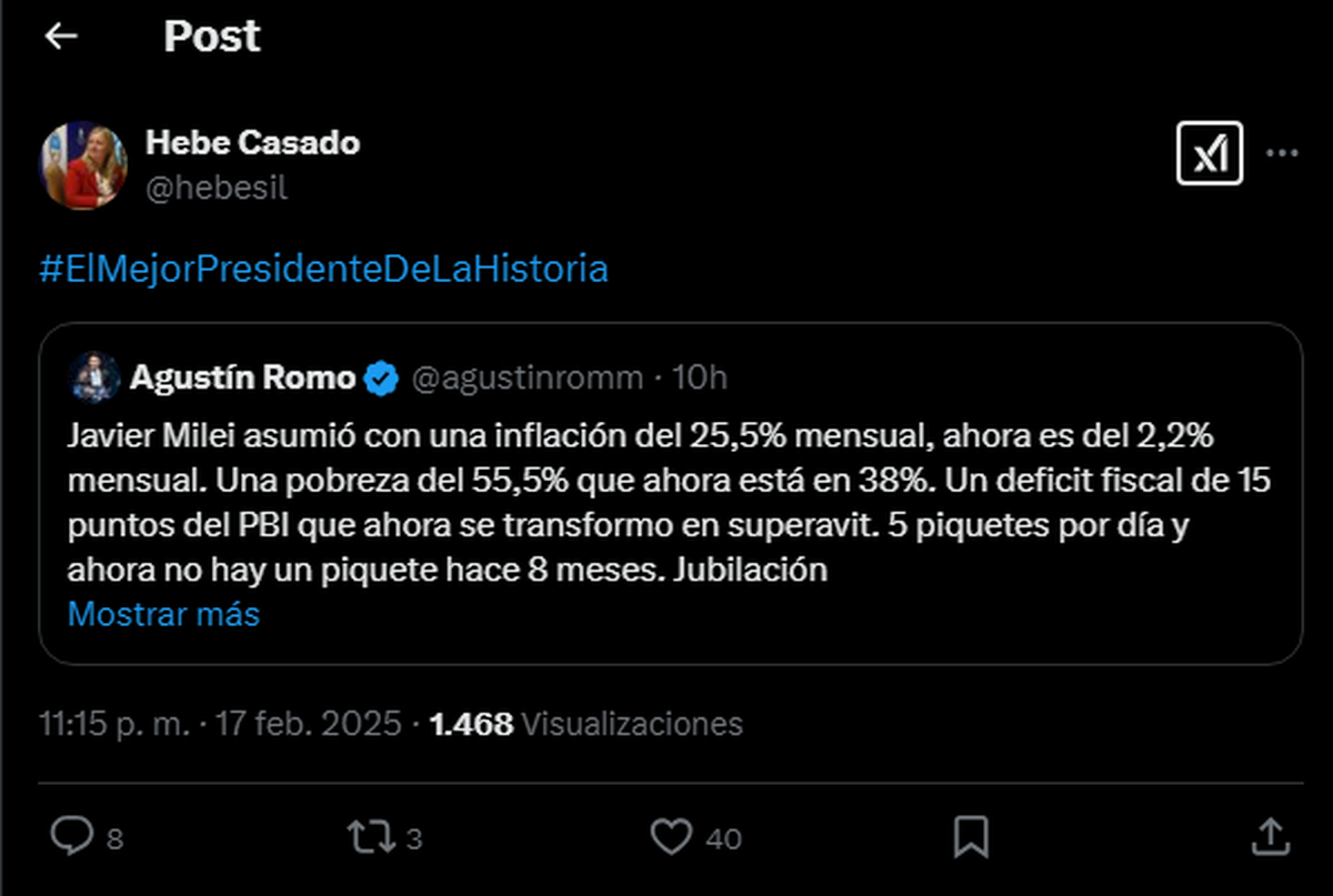 "Javier Milei asumió con una inflación del 25,5% mensual, ahora es del 2,2% mensual. Una pobreza del 55,5% que ahora está en 38%. Un déficit fiscal de 15 puntos del PBI que ahora se transformó en superávit. 5 piquetes por día y ahora no hay un piquete hace 8 meses".