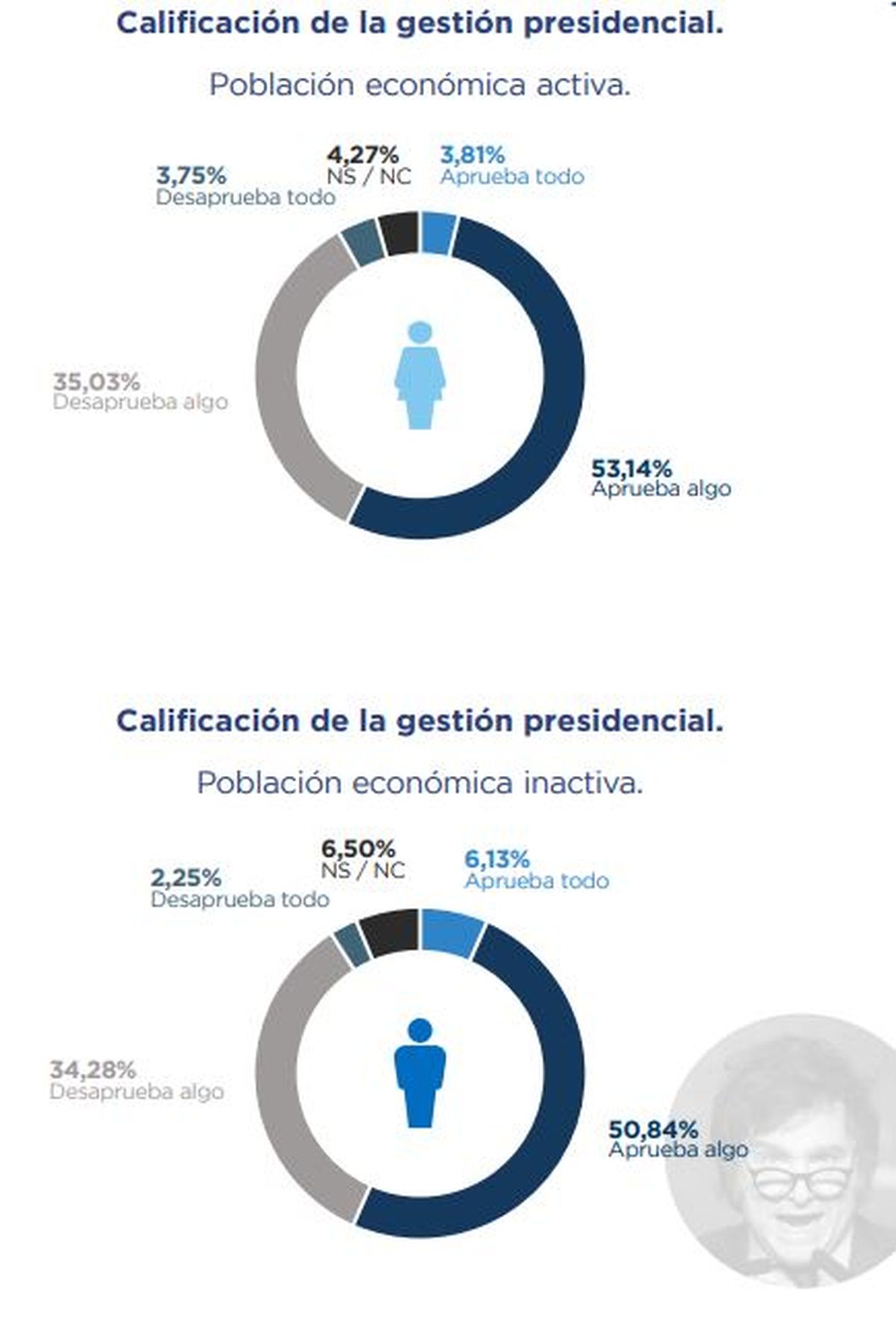 En la Población Económicamente Inactiva (PEI) el 50,84% está de acuerdo con algunas medidas y el 6,13% está de acuerdo en todo. En el área de los descontentos, el 34,28 desaprueba algunas cuestiones y el 2,25% todo.