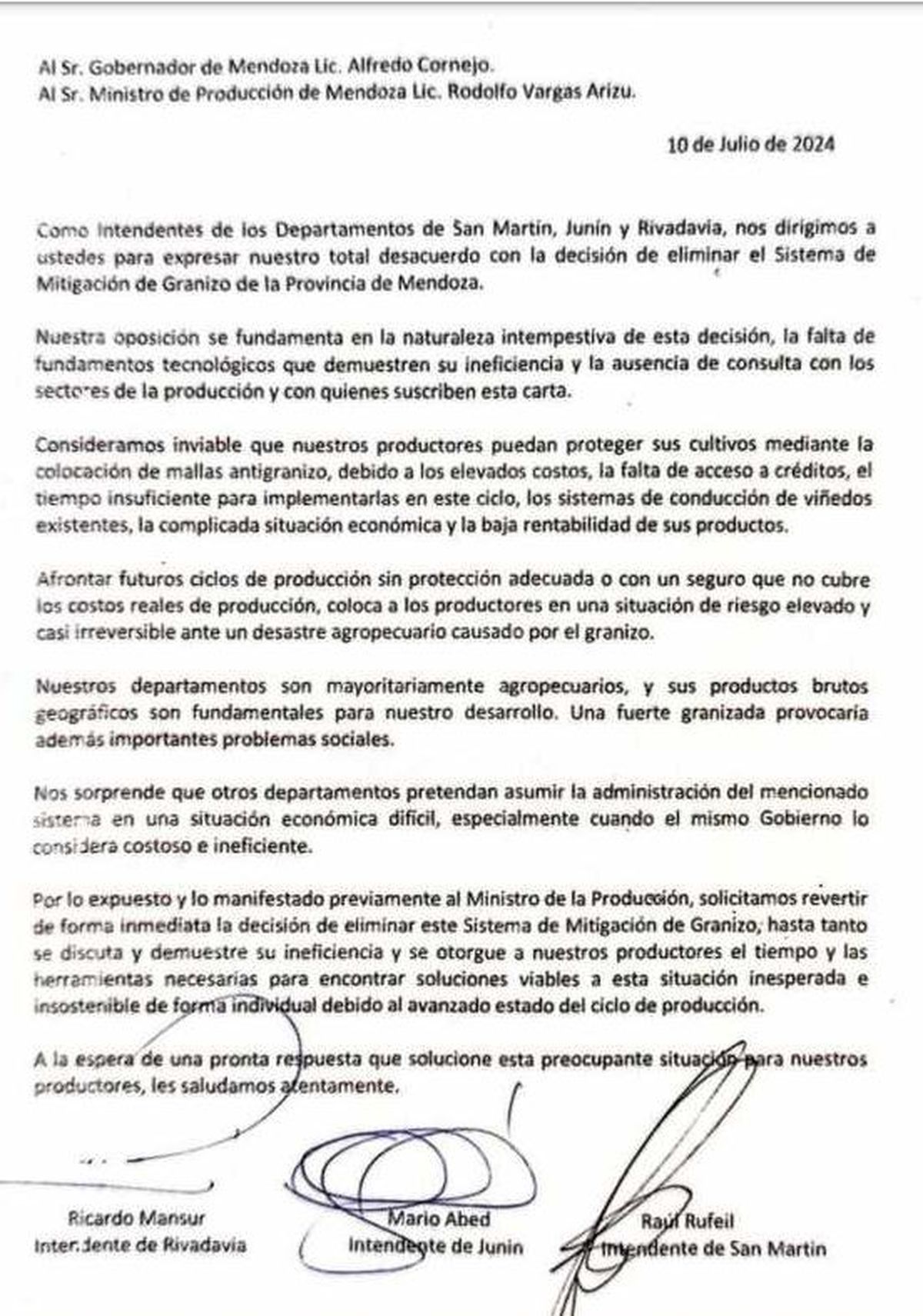 La nota de Abed, Rufeil y Mansur terminó con el pedido al ministro Vargas Arizu de que revierta de forma inmediata la eliminación de la lucha antigranizo "y se debatan soluciones viables".