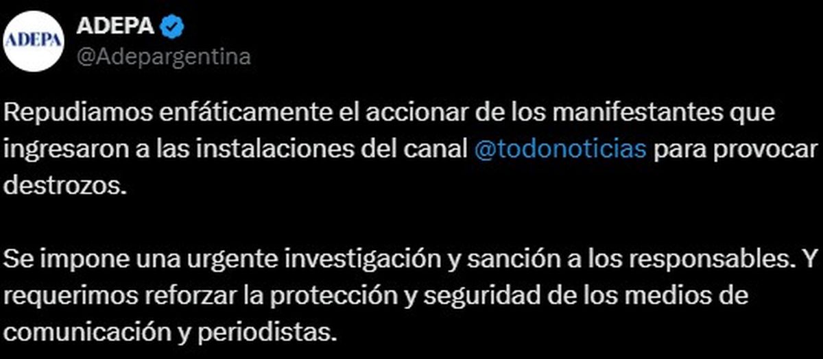 “Repudiamos el accionar de los manifestantes que ingresaron a @todonoticias para provocar destrozos. Se impone una urgente investigación y sanción a los responsables”, publicó la entidad en su cuenta oficial de X (ex Twitter).