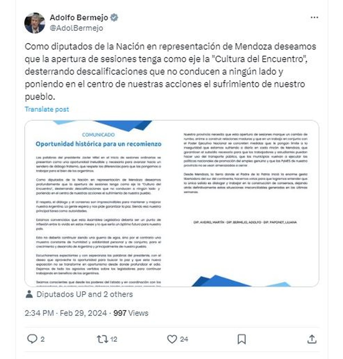 Antes del discurso el mismo Bermejo y sus compañeros de banca peronista, Liliana Paponet y Martín Aveiro publicaron un comunicado al que titular de "Oportunidad histórica" en el que instan al presidente a iniciar las sesiones en el marco de la "Cultura del Encuentro, desterrando descalificaciones que no conducen a ningún lado", remarcó el maipucino en su cuenta de X.