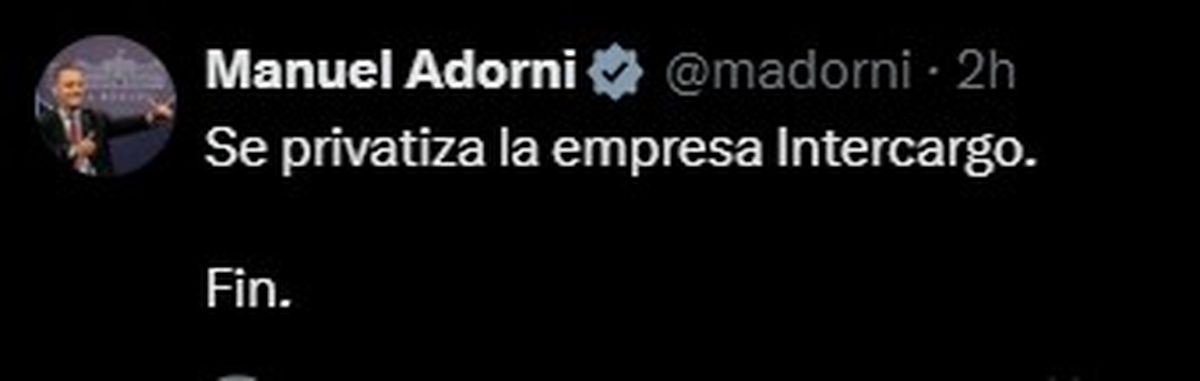 En las primeras horas de este martes, el vocero presidencial Manuel Adorni publicó en su cuenta de X: “Se privatiza la empresa Intercargo. Fin”.