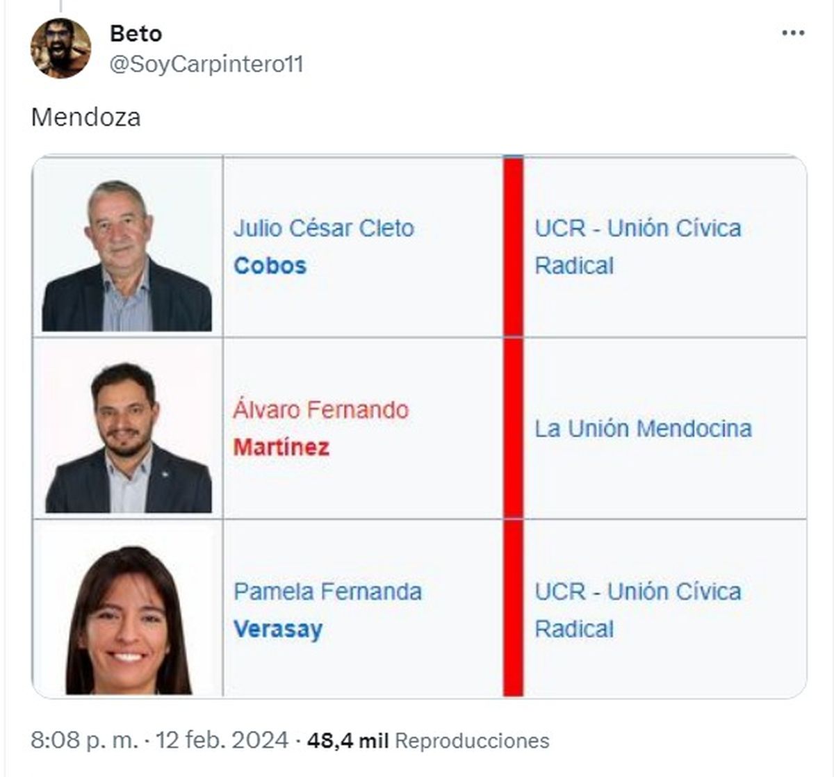 Más abajo figura una serie de cuadros que muestran -supuestamente- a quienes votaron en contra de la Ley Ómnibus. En el apartado de Mendoza se indica lo siguiente: