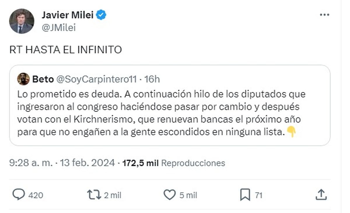 En la mencionada cadena de tuits que difundió Milei se lee: "Lo prometido es deuda. A continuación hilo de los diputados que ingresaron al Congreso haciéndose pasar por cambio y después votan con el kirchnerismo, que renuevan bancas el próximo año para que no engañen a la gente escondidos en ninguna lista" (sic).