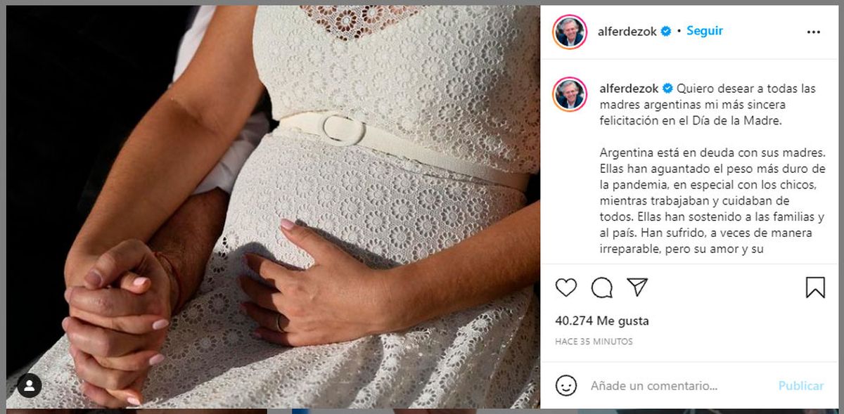(Editado por Marcos Barrera) Con motivo de saludar por el Día de la Madre, el presidente Alberto Fernández comunicó que el bebé que espera con su pareja la primera dama Fabiola Yañez es un nene. El anuncio lo hizo en su cuenta de Instagram a la que acompañó con foto de la panza de su pareja y tomados de la mano.