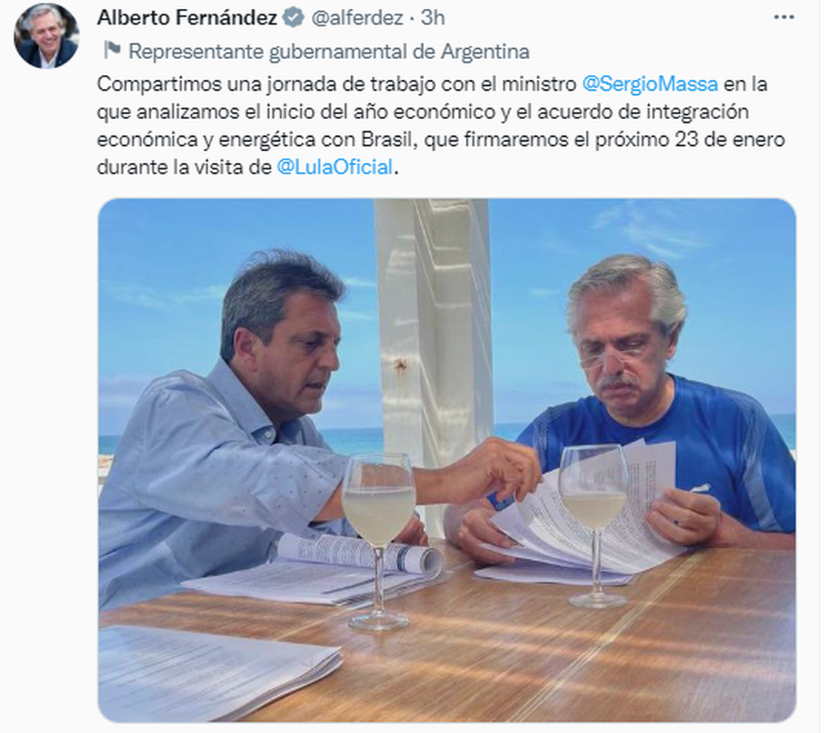 "Compartimos una jornada de trabajo con el ministro Sergio Massa en la que analizamos el inicio del año económico y el acuerdo de integración económica y energética con Brasil, que firmaremos el próximo 23 de enero durante la visita de Lula", escribió Fernández en su cuenta de Twitter, en la que también publicó una foto del encuentro con el funcionario.