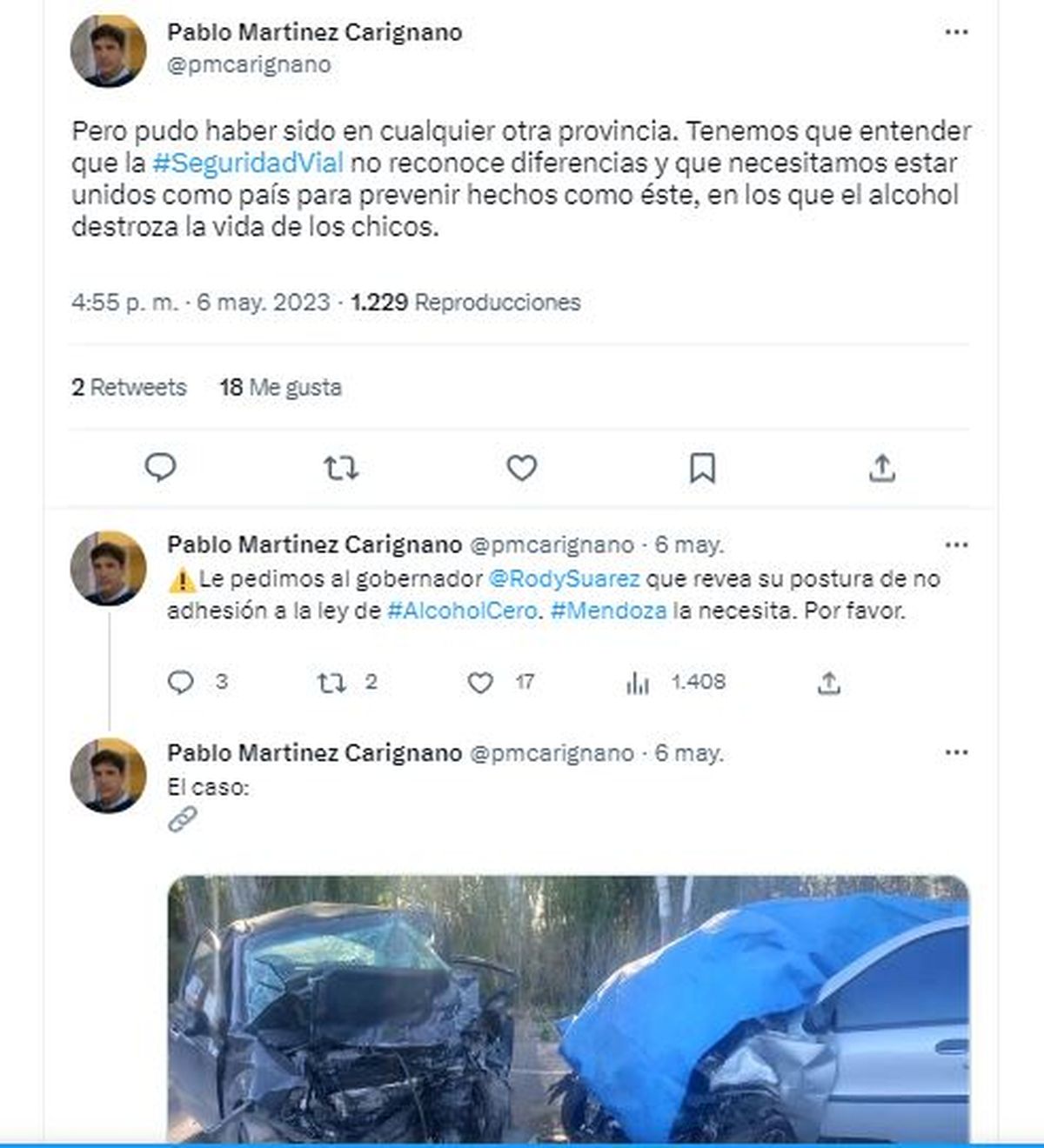 "Tenemos que entender que la #SeguridadVial no reconoce diferencias y que necesitamos estar unidos como país para prevenir hechos como éste, en los que el alcohol destroza la vida de los chicos", continuó en su largo hilo y recalcó: "Le pedimos al gobernador @RodySuarez que revea su postura de no adhesión a la ley de #AlcoholCero. #Mendoza la necesita. Por favor".