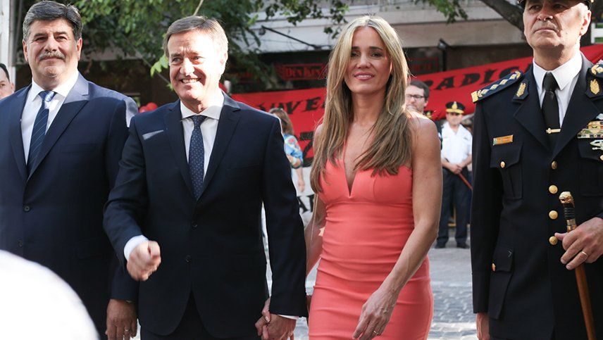 Fabiana Calleja salió de la Legislatura junto a su marido, Rodolfo Suarez, el gobernador de Mendoza y juntos se dirigieron a saludar a la militancia que se había apostado en peatonal Sarmiento detrás de una valla.