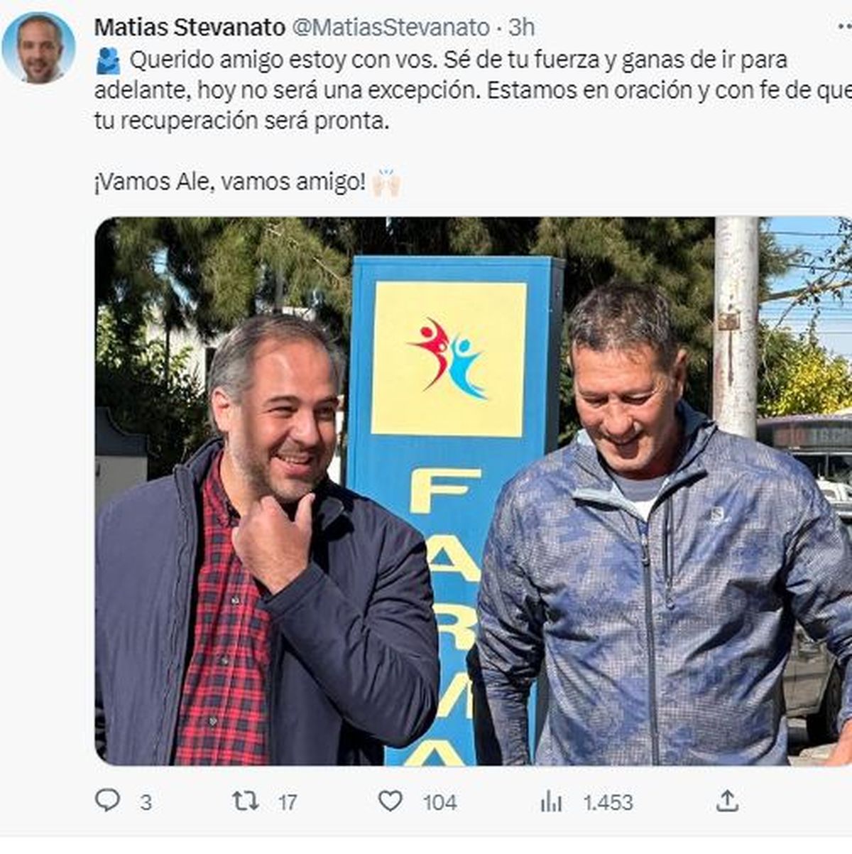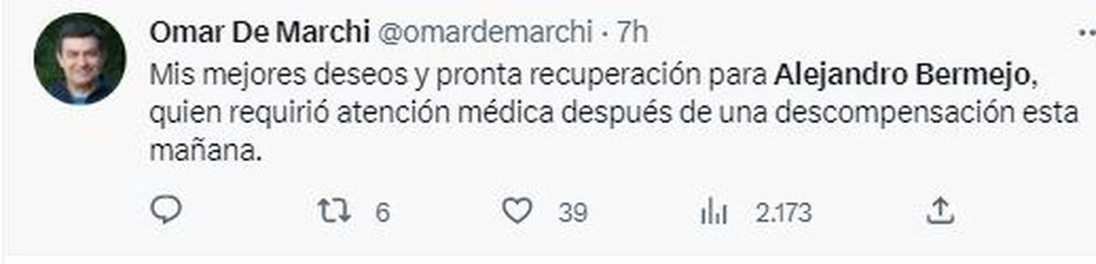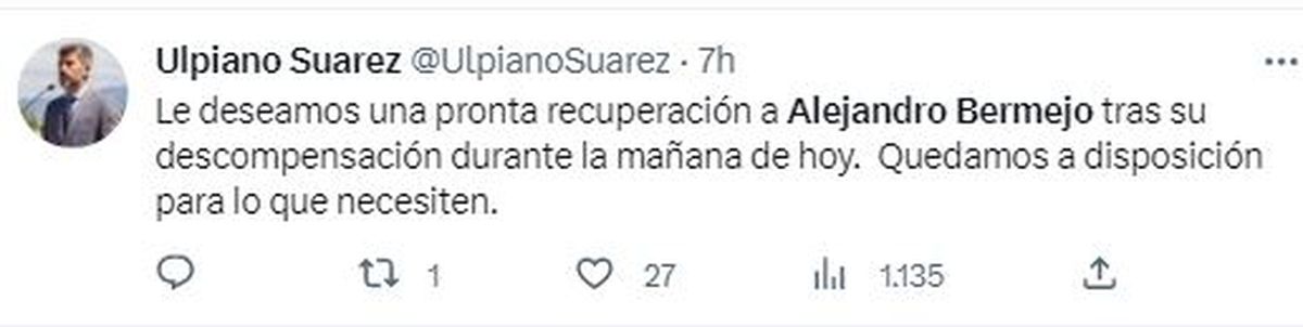 El propio Adolfo Bermejo informó después en su cuenta de Twitter: "Quiero agradecer en nombre de nuestra familia todas las muestras de cariño y las oraciones por la salud de mi hermano Alejandro Bermejo. Toda esta energía positiva y la fuerza de la oración se siente y permitirá que Ale salga adelante".