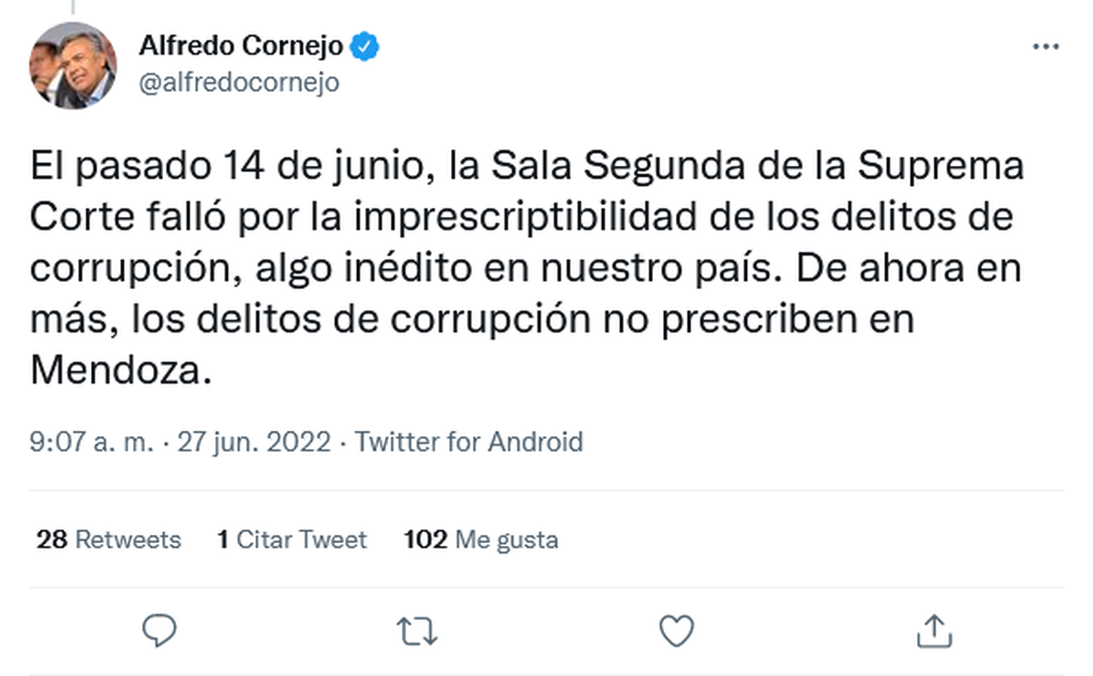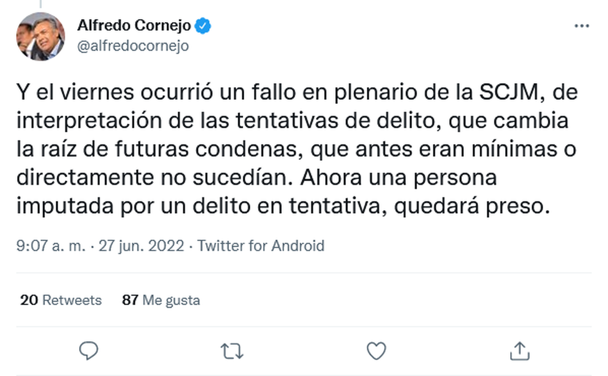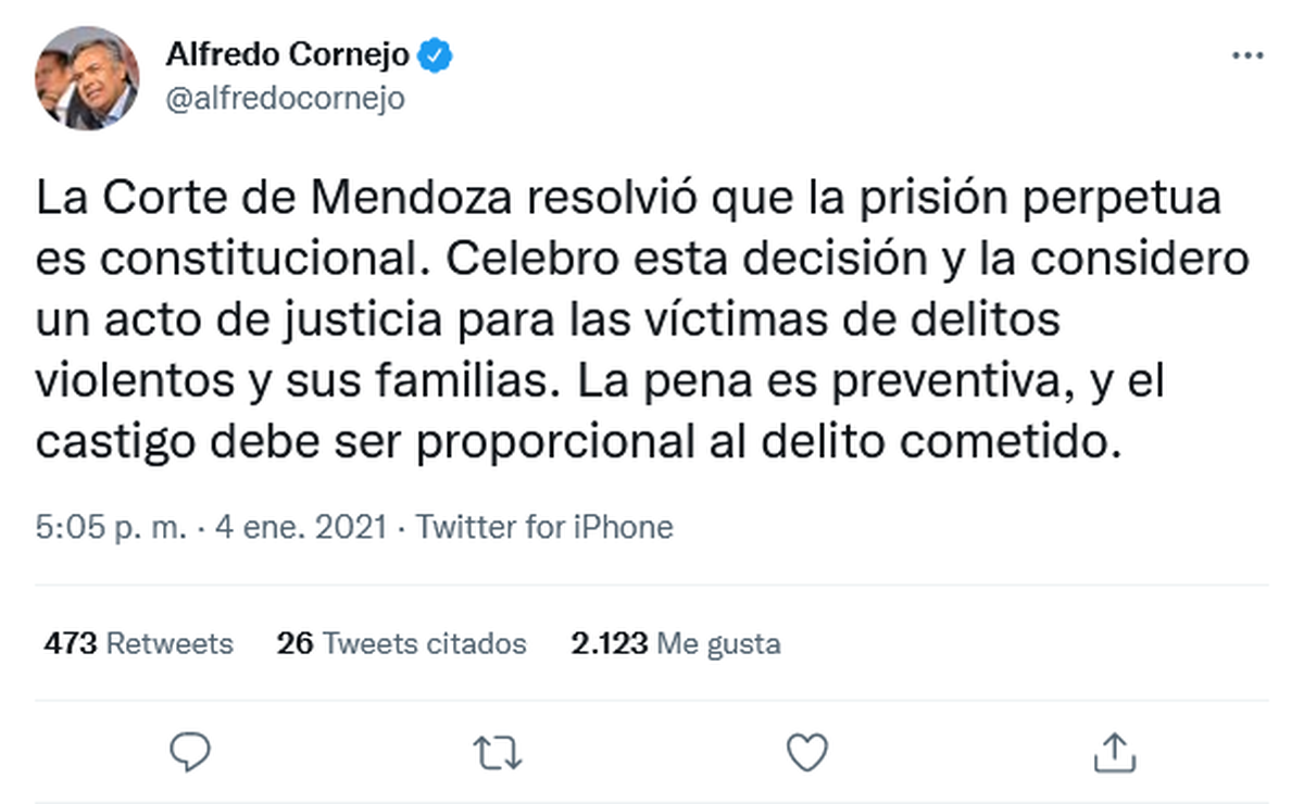 Así se refirió Alfredo Cornejo a la sentencia de la Suprema Corte del 30 de diciembre de 2020 -se conoció 5 días después-, que en fallo plenario, confirmó en decisión unánime, que la prisión perpetua es constitucional.