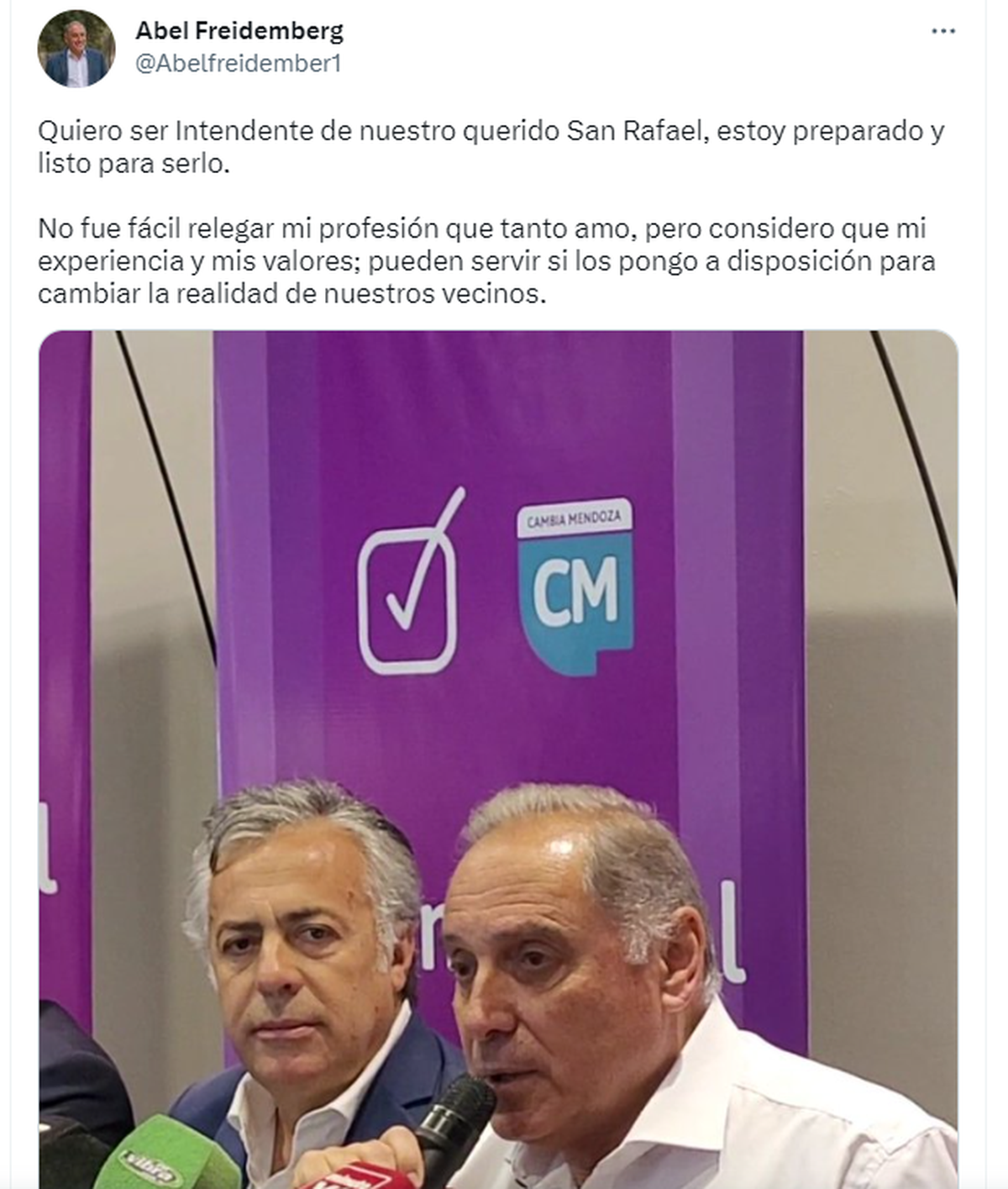 Con ese objetivo en la mira, este lunes el sector que lidera Alfredo Cornejo lanzó al médico y senador provincial, Abel Freidemberg, que volverá a competir por esa comuna luego de que en el 2019 cayera derrotado por el intendente Emir Félix.