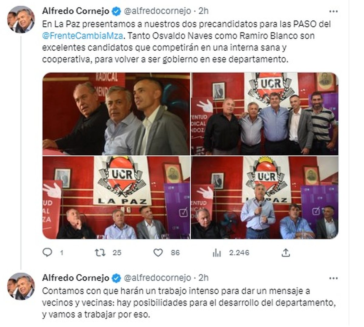 En su carrera por la gobernación de Mendoza, el radical Alfredo Cornejo no descuida los departamentos. Así, en la mañana de este miércoles, concurrió a La Paz -departamento que el kirchnerismo ganó en el 2019, después de 19 años de gestión radical- por ser uno de los siete departamentos que desdobla. Lo hizo para presentar a dos precandidatos a intendente por el frente oficialista.