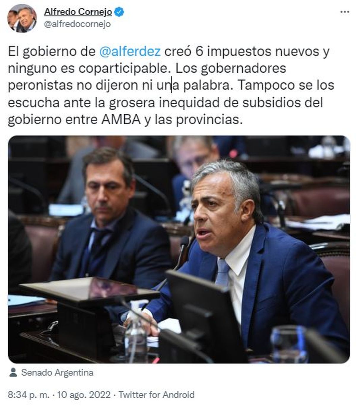 Cornejo argumentó su voto en el recinto y luego en las redes sociales: "El gobierno de Alberto Fernández creó seis impuestos nuevos y ninguno es coparticipable. Los gobernadores peronistas no dijeron ni una palabra. Tampoco se los escucha ante la grosera inequidad de subsidios del gobierno entre AMBA y provincias.