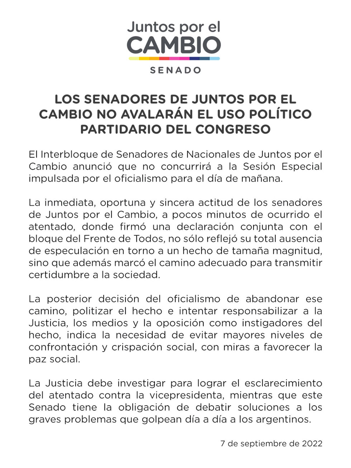 "La inmediata, oportuna y sincera actitud de los senadores de Juntos por el Cambio, a pocos minutos de ocurrido el atentado, donde se firmó una declaración junto con el bloque del Frente de Todos, no sólo reflejó su total ausencia de especulación en torno a un hecho de tamaña magnitud, sino que además marcó el camino adecuado para transmitir certidumbre a la sociedad", destacaron los senadores opositores en el comunicado.