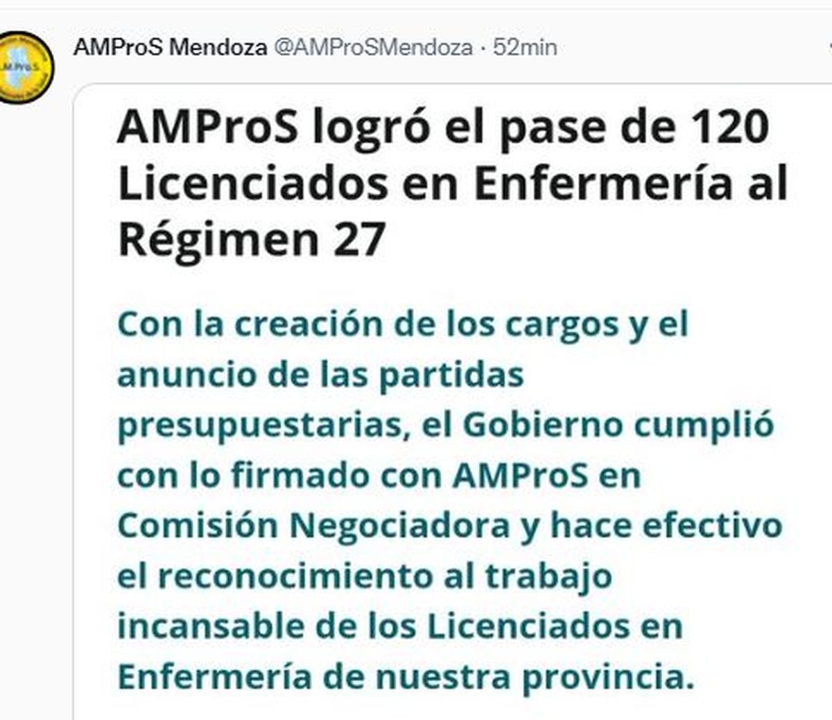 Desde la entidad sindical dijeron que "luego de la intensa lucha gremial liderada por AMPROS, el Gobierno de Mendoza oficializó este martes el pase de 120 Licenciados en Enfermería al Régimen 27 de Salud. En cumplimiento a lo firmado en Comisión Negociadora, el Ejecutivo anunció la creación de los cargos y la asignación de partida presupuestaria".