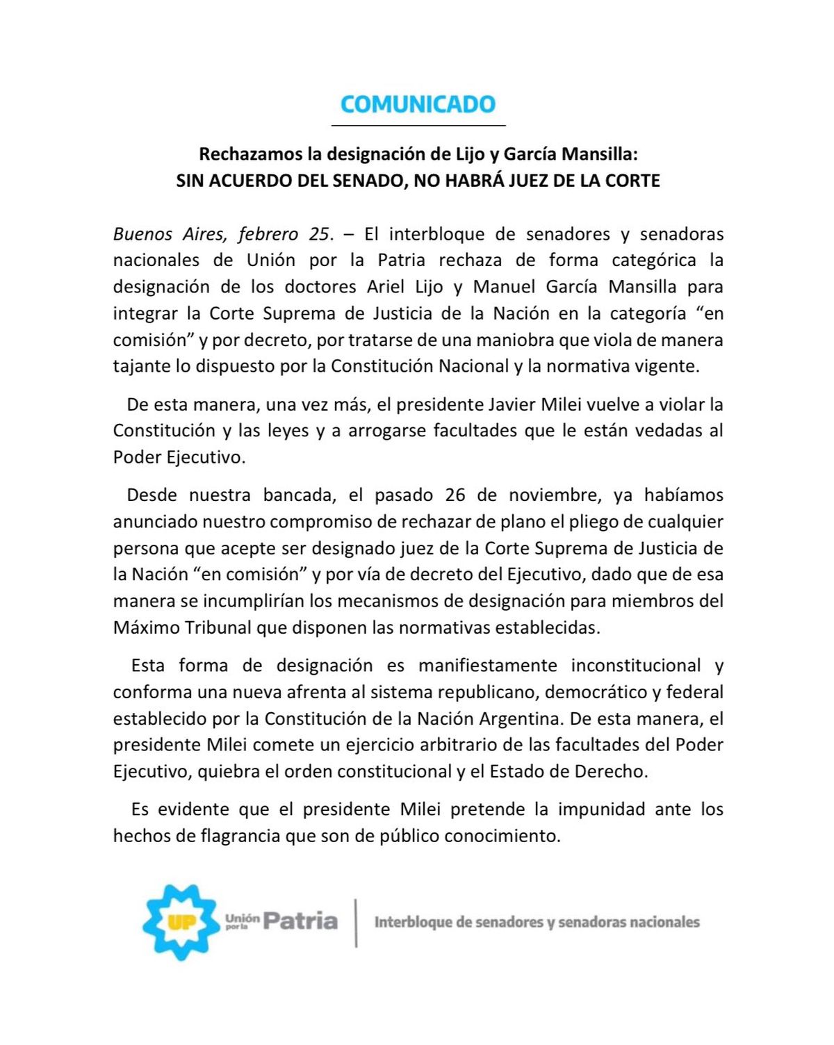 El interbloque de senadores nacionales de Unión por la Patria rechazó “de forma categórica la designación de los doctores Ariel Lijo y Manuel García Mansilla para integrar la Corte Suprema de Justicia de la Nación en la categoría en comisión y por decreto, por tratarse de una maniobra que viola de manera tajante lo dispuesto por la Constitución Nacional y la normativa vigente”, informó el sitio especializado Parlamentario.