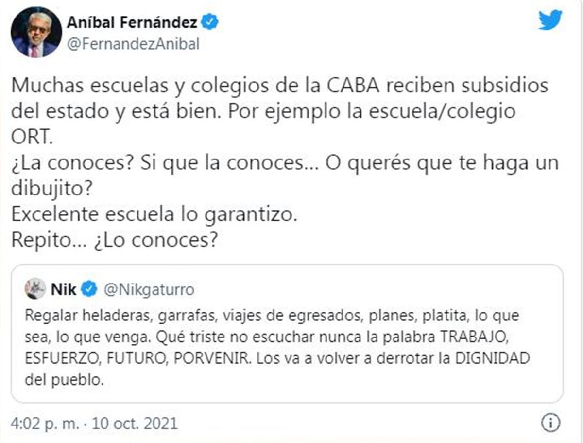 (Editado por Marcos Barrera) El ministro de Seguridad, Aníbal Fernández, aseguró este martes que su polémico tuit contra el humorista Nik fue parte de "un debate" y se quejó de que el caricaturista "vive agraviando" al Gobierno.