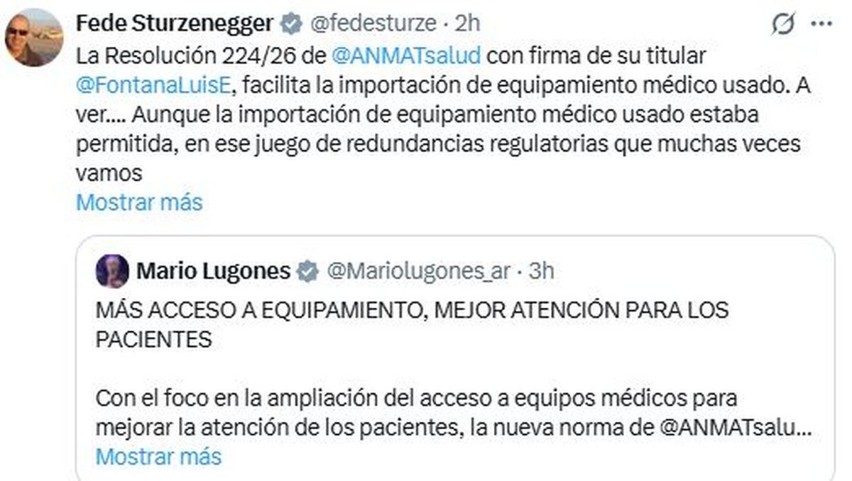 “Con el foco puesto en ampliar el acceso a equipos médicos para mejorar la atención de los pacientes, la nueva norma facilita el ingreso de equipamiento usado y reacondicionado, seguro y de calidad”, afirmó también a través de la red social X.