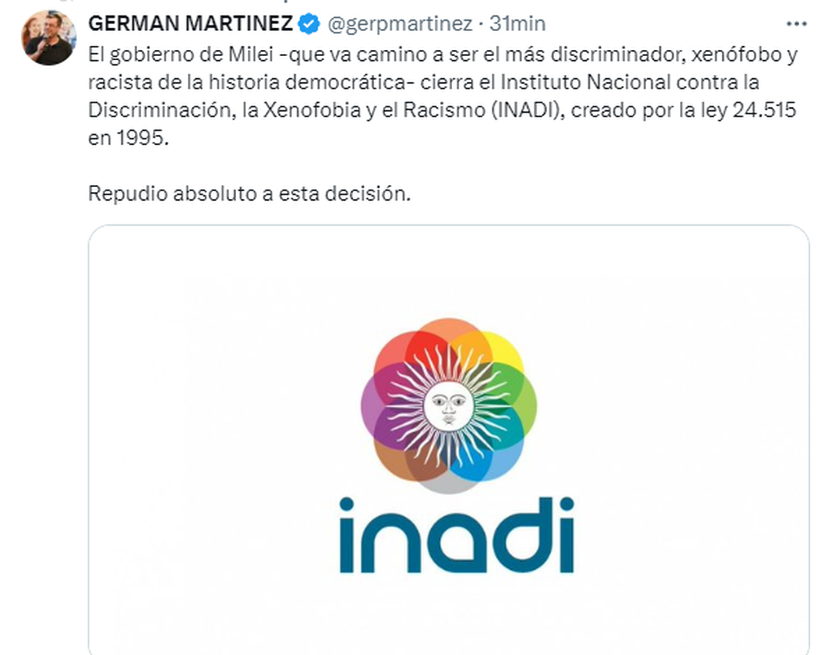“Uno de los ideales del Presidente Milei es la reducción del Estado y la eliminación de todo lo que no genere un beneficio para los argentinos. Se tomó la decisión de avanzar en el desmantelamiento de diferentes institutos que efectivamente no sirven absolutamente para nada o son grandes cajas de la política o lugares para generar empleo militante y el primero de ellos va a ser el Inadi”.