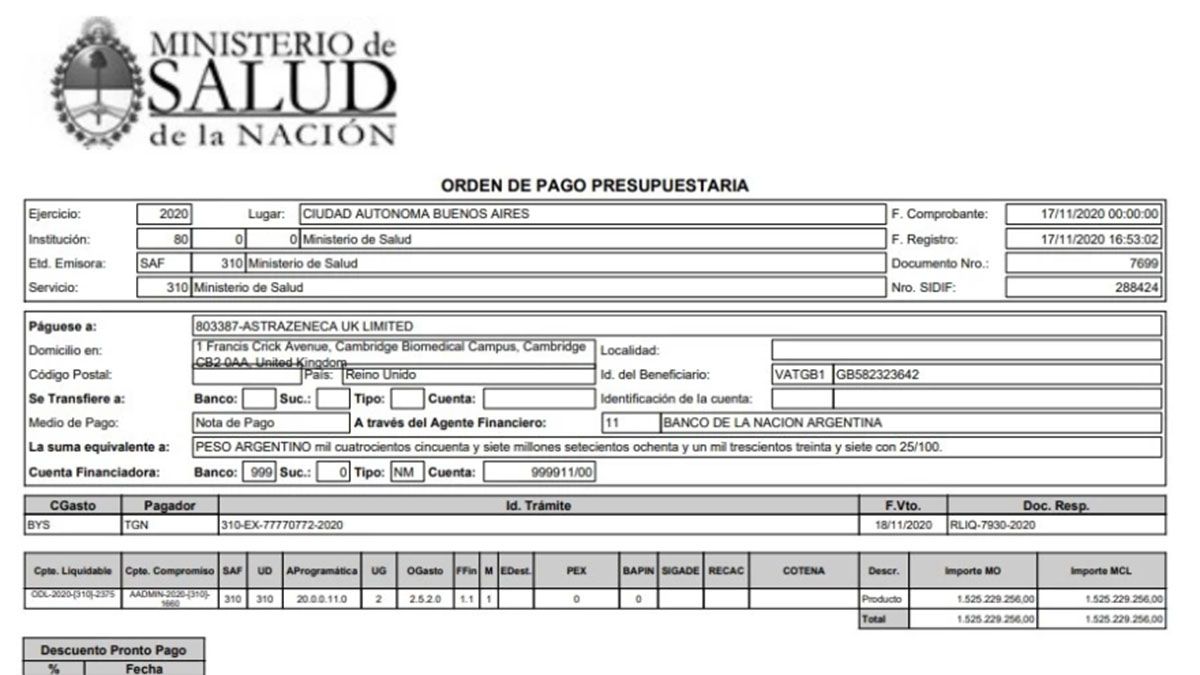 Orden de pago por casi 18 millones de dólares para AstraZeneca en concepto de "anticipo", que derivó en una denuncia penal contra el presidente Alberto Fernández y el empresario Hugo Sigman.