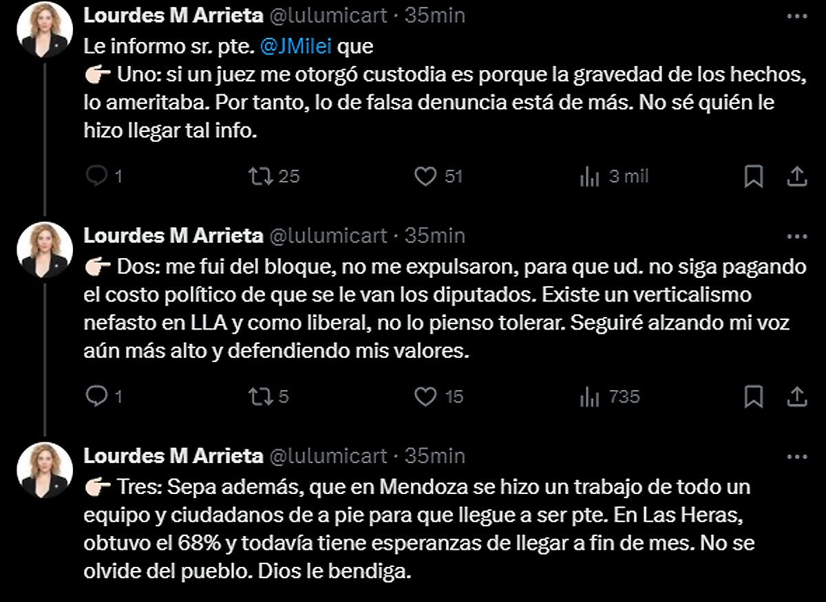 Javier Milei dijo que Lourdes Arrieta fue expulsada de partido por hacer falsas denuncias. La mendocina no se quedó callada
