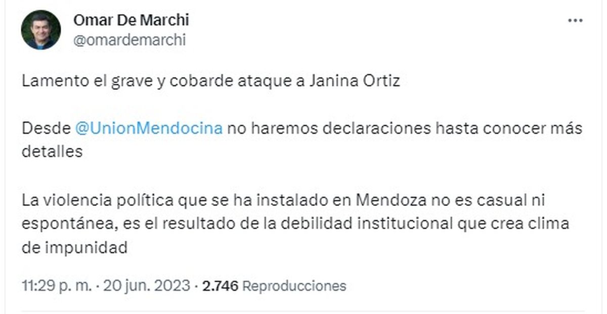 El candidato a gobernador por el frente La Unión Mendocina, Omar De Marchi, lamentó el "grave y cobarde ataque" a Janina Ortiz, funcionaria de Las Heras y pareja de su candidato a la vicegobernación, Daniel Orozco. Sin embargo, adelantó que su fuerza esperará a tener más datos antes de explayarse sobre el tema.