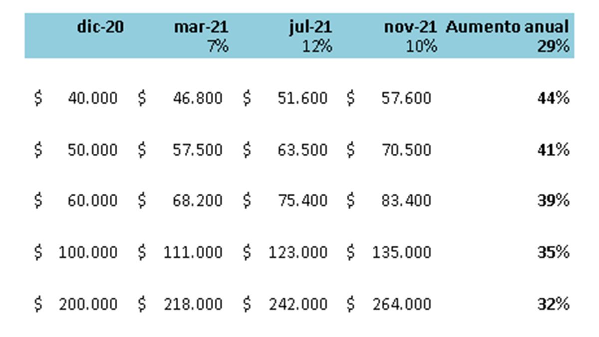 Con la nueva propuesta, se incrementan los aumentos de julio y octubre, quedando los tramos para 2021: 7% en marzo, 12% en julio y 10% en octubre, es decir, 29% de aumento más el bono de carácter no remunerativo.