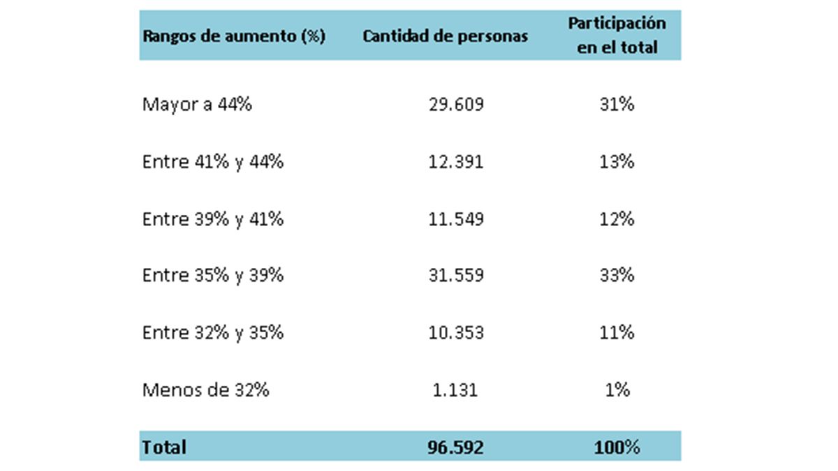 De la recomposición salarial ofrecida se desprende que 42.000 empleados públicos, es decir el 44% de la planta estatal, percibirán un aumento mayor al 41%. Mientras que otros 43.108 empleados percibirán aumentos de entre 35% y 40% (ellos representan un 45% de la planta estatal). Es decir, el 89% de la planta recibirá aumentos superiores al 35%.