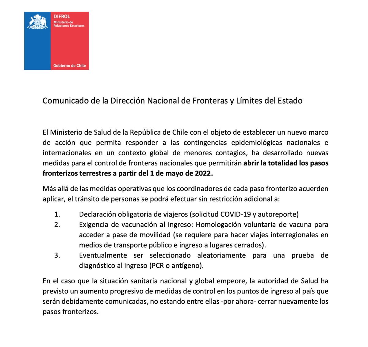 "Me comuniqué con mi par chilena y me confirmó que a partir del 1º de mayo vuelven a abrir todos los pasos terrestres que unen Argentina y Chile", escribió el funcionario. Además, compartió el siguiente documento: