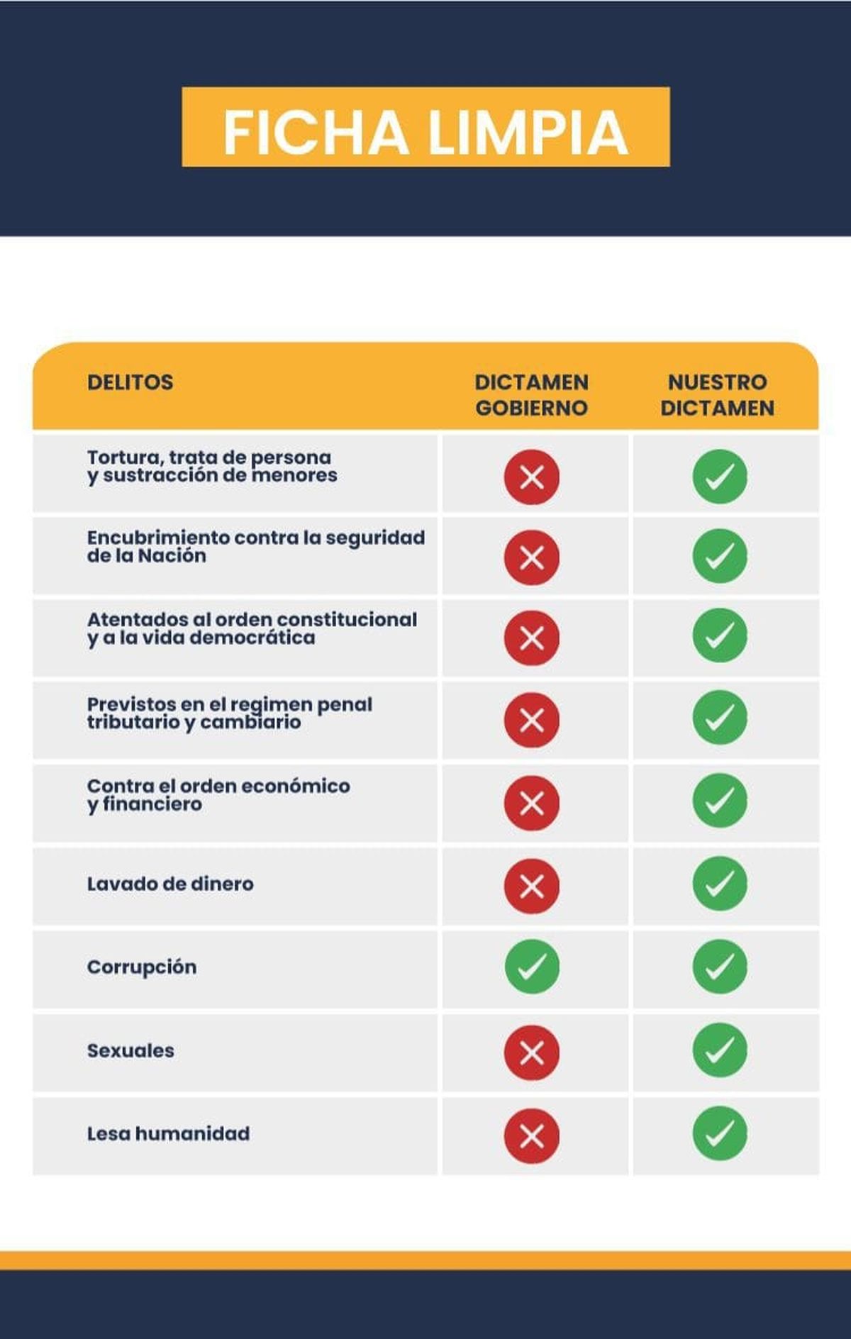 "Con el modelo de ellos, sólo se les impide ser candidatos a quienes tienen delitos de corrupción; en cambio quien tenga una condena por narco o por una violación sí puede serlo. Es una incoherencia", retrucaron los diputados mendocinos. Y aportaron un cuadro comparativo entre el dictamen oficialista y lo que incluye el dictamen de Unión por la Patria.