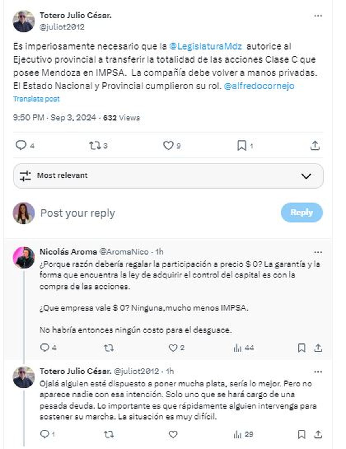 De hecho, así lo marcó Julio Totero, que hasta hace unas semanas integró el directorio de IMPSA en representación del Estado mendocino. "Lo importante es que rápidamente alguien intervenga para sostener su marcha. La situación es muy difícil", posteó el exfuncionario que renunció a su cargo recientemente.
