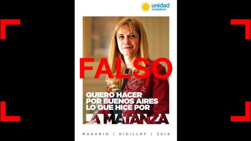 Desde que el diputado nacional Axel Kicillof y la intendenta de La Matanza, Verónica Magario, -ambos del Frente para la Victoria- confirmaron su candidatura como gobernador y vicegobernadora de Buenos Aires el 27 de mayo último, circula en redes sociales un supuesto aviso de campaña con una foto de Magario y una leyenda que dice: “Quiero hacer por Buenos Aires lo que hice por La Matanza”. En la parte inferior se leen los nombres de Magario y Kicillof y el año 2019, junto con el logo de “Unidad Ciudadana”. Sin embargo, esta pieza no es oficial: es falsa.