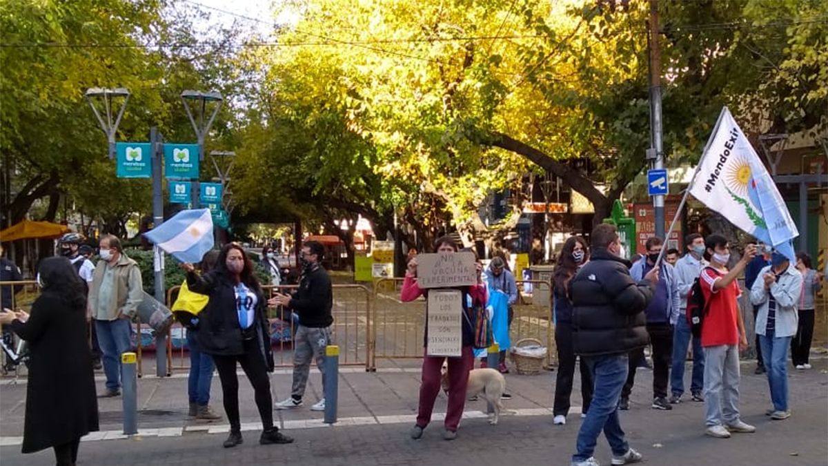 Los manifestantes que este martes protestaron contra las nuevas restricciones en Mendoza impuestas por el confinamiento se encontraron con una fuerte presencia policial y con la Peatonal Sarmiento, lugar en el que se iban a manifestar, toda vallada.