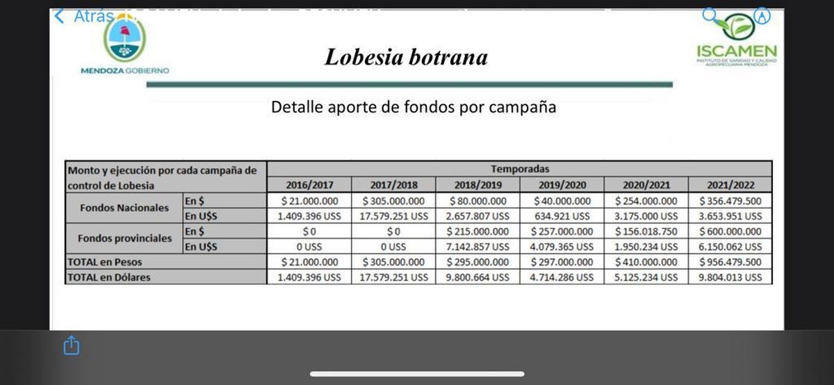 La lucha contra esta plaga es clave para los productores mendocinos, y por eso se entiende que el reclamo por quien pone el dinero para ese combate se haya filtrado en la campaña del año pasado. Por un lado el ministro de Economía Enrique Vaquié le recordaba a la Nación que debía enviar $1.382 millones para esa lucha, y por otro la senadora nacional, Anabel Fernández Sagasti presentaba un proyecto para que el Ejecutivo dispusiera la asignación de una partida presupuestaria especial para cumplir con lo que estipula el Programa Nacional de Prevención y Erradicación de Lobesia Botrana.