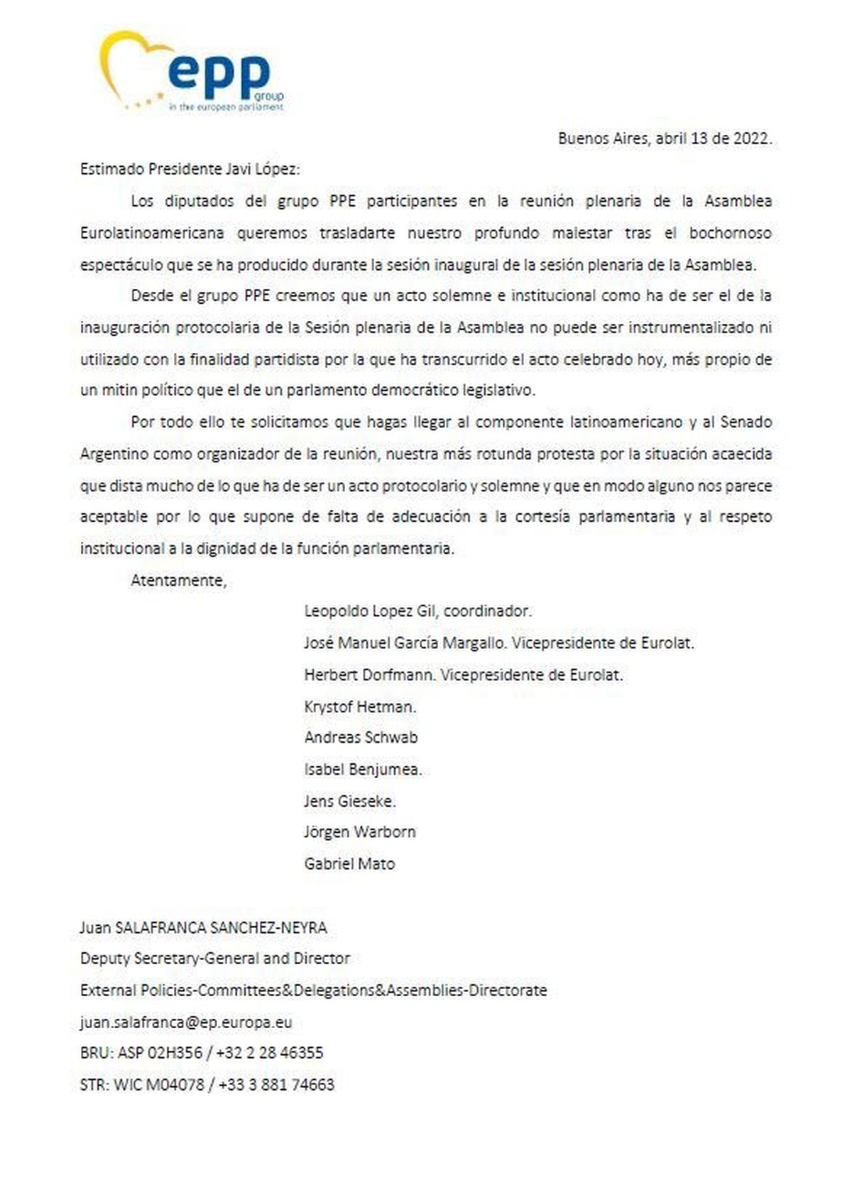 Las exclamaciones y aplausos incomodaron tanto a un grupo de parlamentarios europeos de centroderecha -del EPP, el "European People's Party"- que publicaron una carta contra el discurso, lo que derivó en que JxC ofreciera su "sincera disculpa a las delegaciones extranjeras".